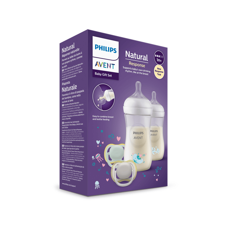 Idealny i barwny zestaw prezentowy do karmienia i kojenia Twojego malucha. Smoczek Natural Response pozwala niemowlęciu pić we własnym tempie — tak samo jakby ssało pierś — ułatwiając łączenie karmienia naturalnego i butelką.
